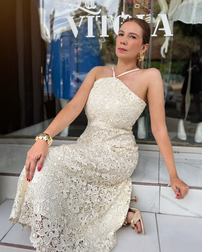 Vestido halter encaje beige