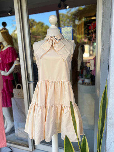Vestido beige moño con perlas