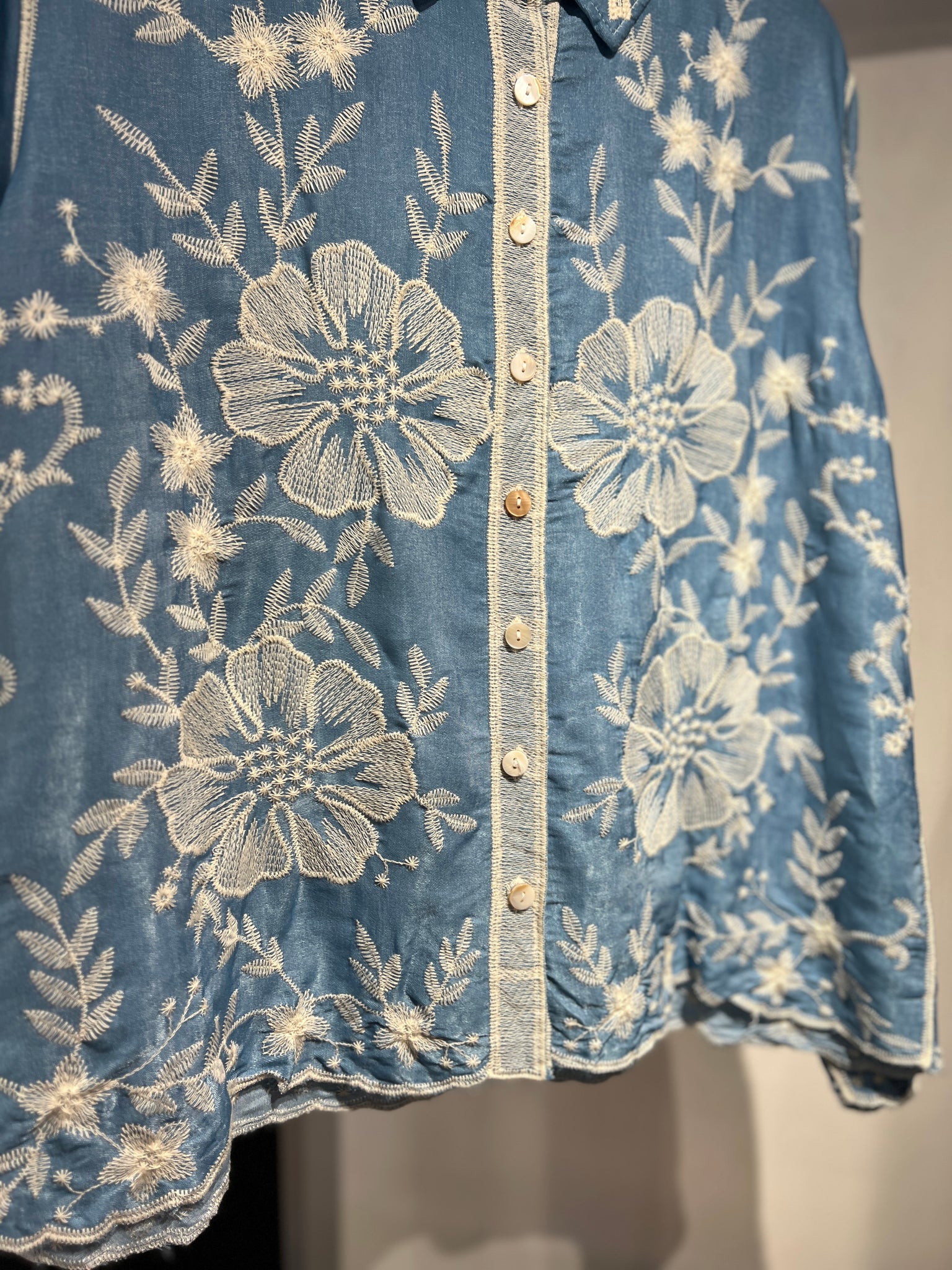 Blusa azul bordado beige