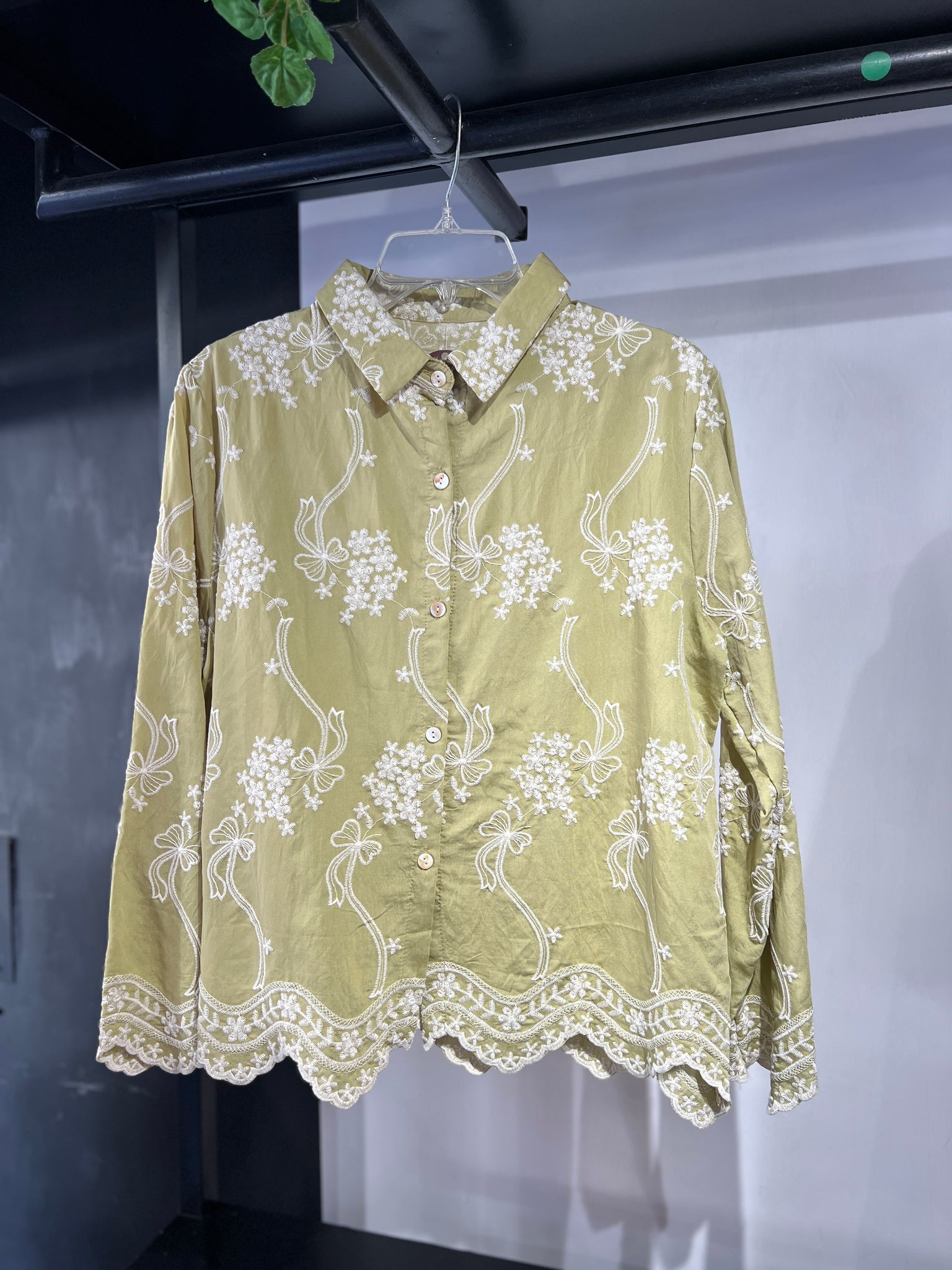 • Cargar imagen en el visor de la galería, Camisa verde bordado beige