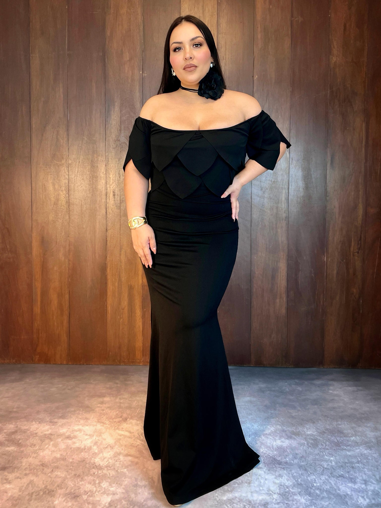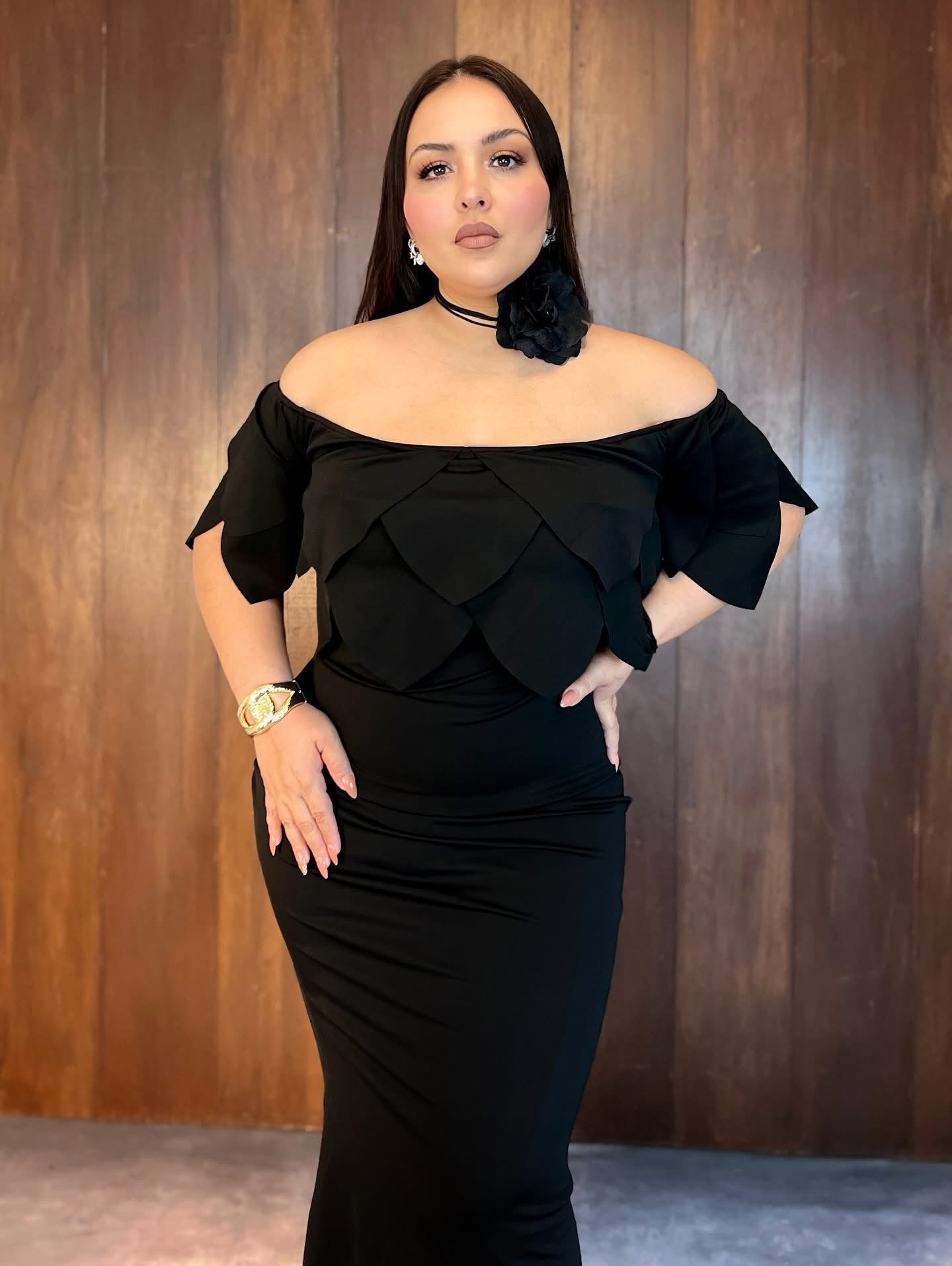 Maxi vestido hombros descubiertos petalos
