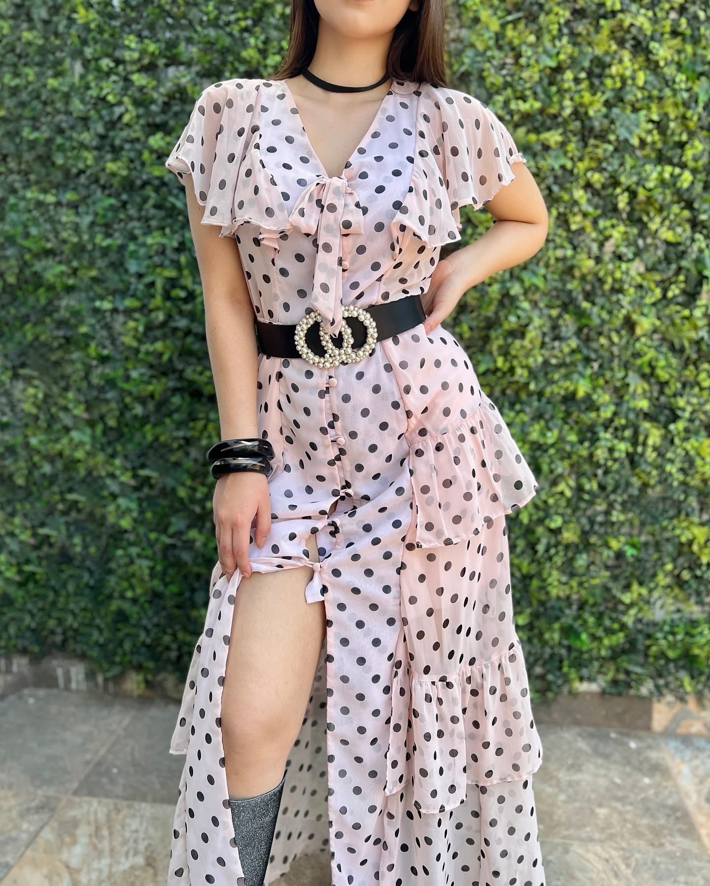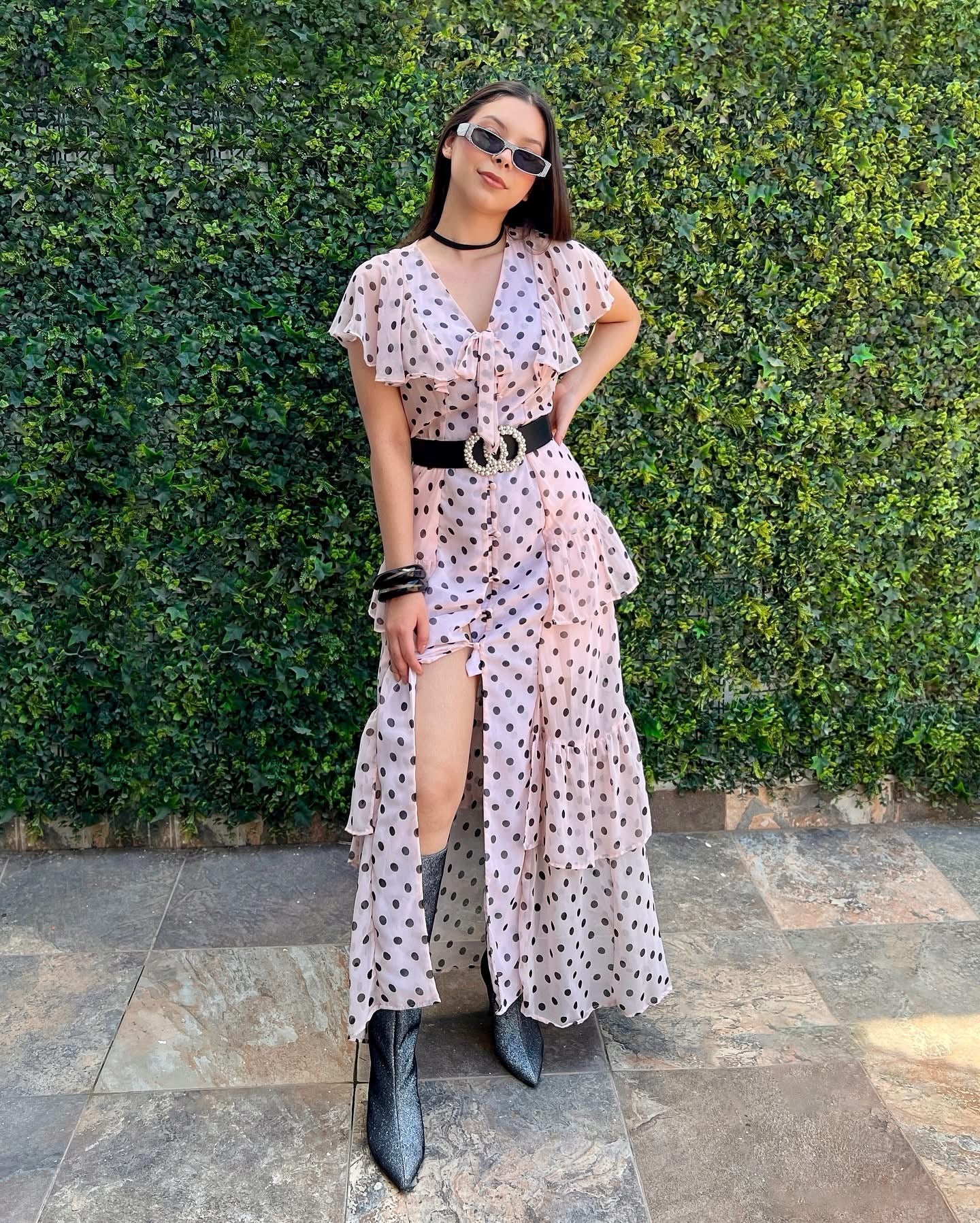 Maxi vestido rosa lunares negros